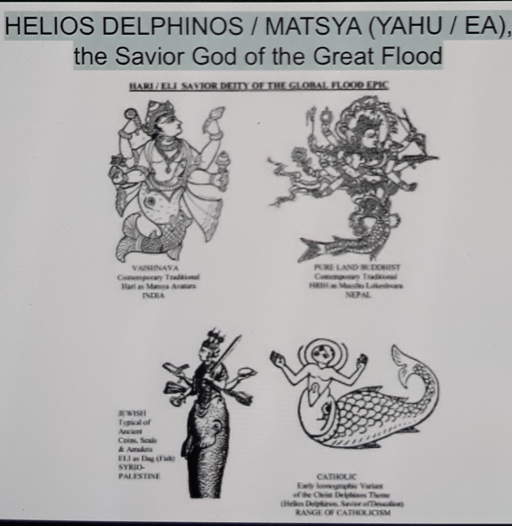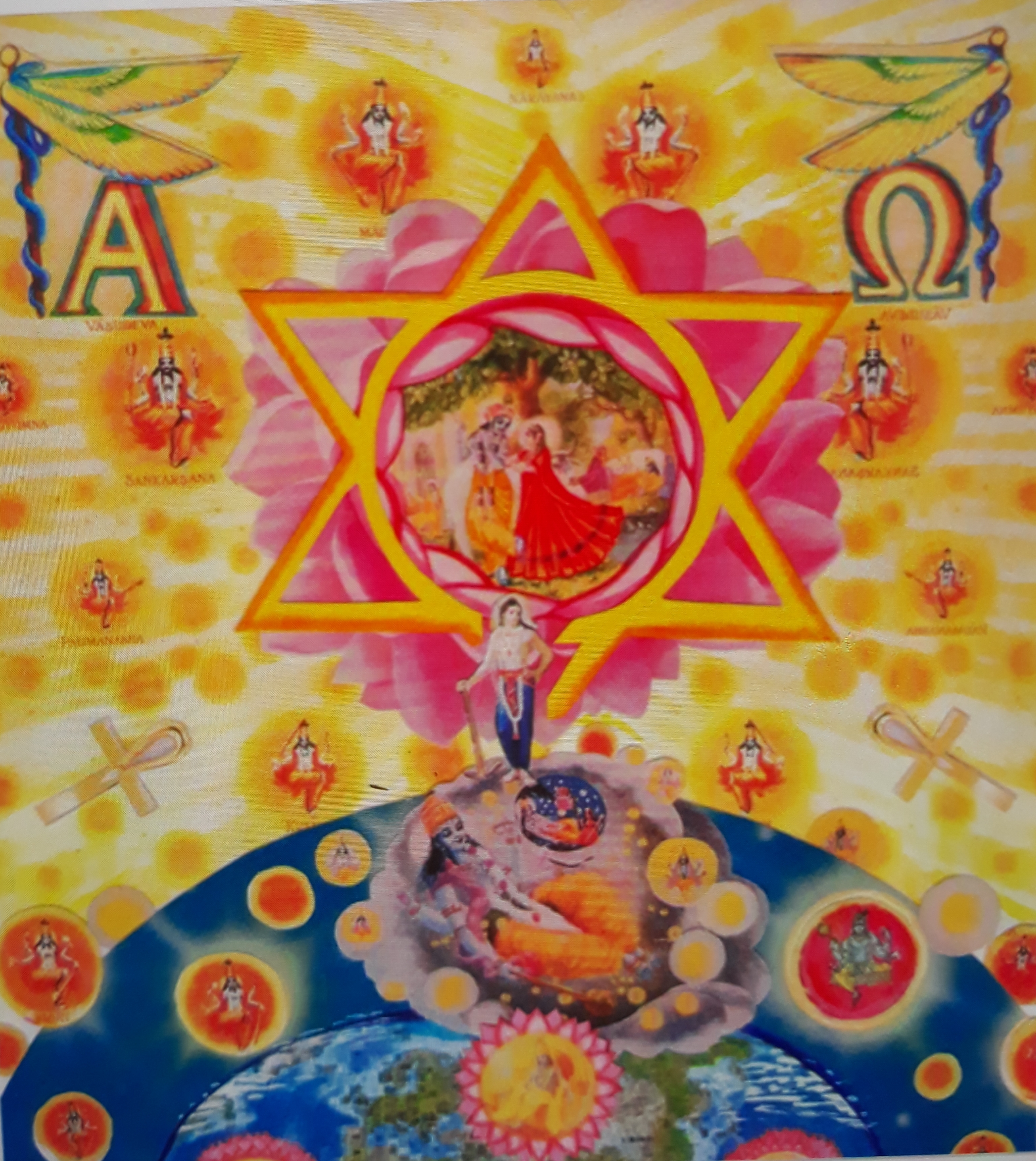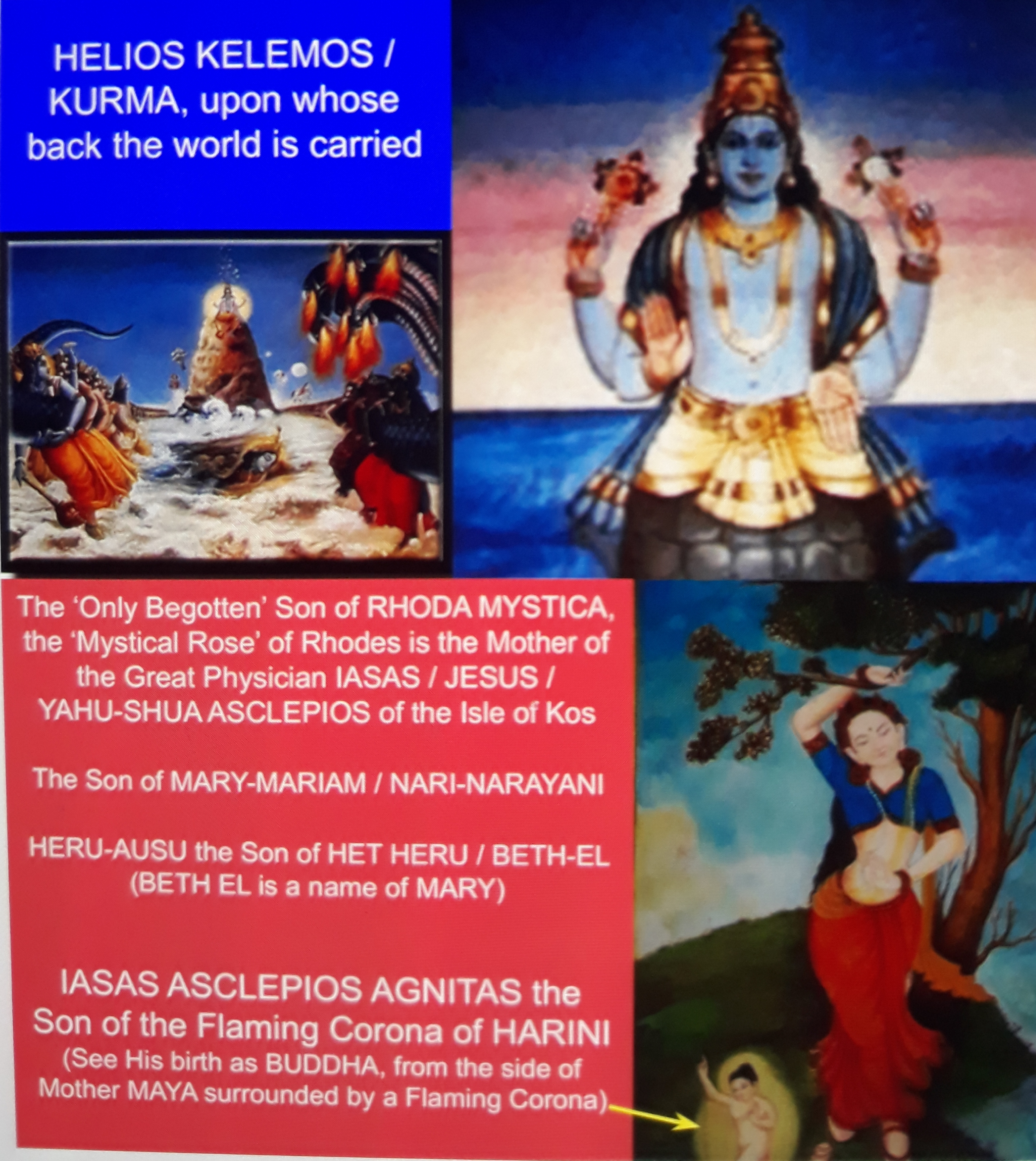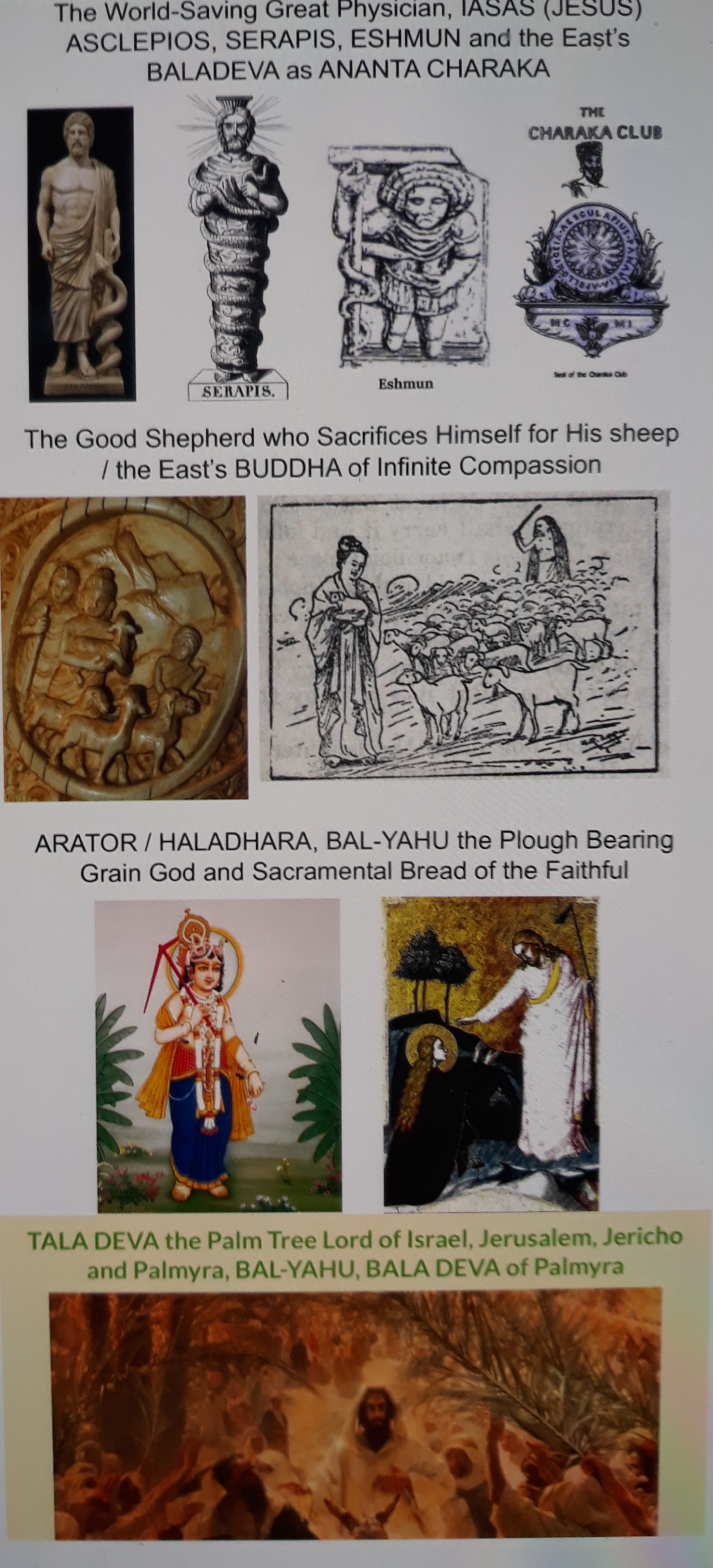 دیوید شرمن امریکایی، قربانی شدن مسیح برای خلقت جهان را با قربانی شدن پوروشه در اساطیر هندو مقایسه میکند که موجودات جهان از جسدش پدید آمدند. سه چهارم پوروشه در جهانی دیگر قرار داشت و آن یک چهارم این دنیاییش تبدیل به موجودات زنده شد و فرود آمدنش به یک جهان دانی، به فرود آمدن خورشید به جهان زیرین در موقع غروب تشبیه میشود. در مصر، خورشید غروب، آتوم نام دارد که نامش قابل تطبیق با آدم ابوالبشر است. در مصر جنوبی، آتوم، هرو واسو نامیده میشود که در این نام، هرو همان هورس است و واسو معادلی برای یسوع یا عیسی. همین واسو در هند تبدیل به واسو دوا (واسوی خدا) و البته ویشنو شده است که دومی خدای بسیار موفقی است. درست به مانند آدم، ویشنو هم یک خدای دوجنسه با نیمه های نرینه و مادینه است که این نیروها به شکل یک زوج به نام های کریشنا (کانها) و رادا در زمین، تجسد انسانی می یابند. دوجنسگی ویشنو از طریق واسو و یسوع به یاهو نسخه ی اولیه ی یهوه میرسد که در ابتدا یک نوع بعل در اریحا و پالمیرا بوده و به سبب نمایندگی نخل ها در طبیعتی مرده و بدل شده به بیابان، با احیای حیات ارتباط دارد و درمان کنندگی مسیح به او میرسد. در هند، بالادوا خدای درمان است و در بل رام یا بالاراما نابرادری کریشنا تجسم زمینی می یابد تا اتحاد بعل و یاهو را که در یهودیت نسخ شده است در مذهب ویشنو برقرار نگه دارد. نام بعل در "پولیوس" یونانی که خدای حامی شهرها و اجتماعات است هم دیده میشود. نام پولیوس، ریشه ی پوروشا است و همانطورکه پوروشا با تجزیه در موجودات زمین، در آنها انعکاس می یابد، پولیوس هم با تجزیه شدن در افراد اجتماع، در آنها انعکاس می یابد. مفهوم قربانی شدن پوروشه برای خلقت جهان نیز هنوز به نوعی در ویشنو هست. یکی از تجسم های قبلی ویشنو، نارایانا است که ویشنو را خوابیده بر بدن یک مار غنوده بر آب های آغازین نشان میدهد و همزمان یک گل نیلوفر آبی از ناف ویشنو درمی آید و بر بالایش برهما خدای خالق ظاهر میشود و جهان جدید را می آفریند. ویشنوی به خواب رفته، خورشید مرده است و برهما خورشید زنده شده که همان هورس آشکار شده بر نیلوفر آبی است. عنوان نارایانا از "نهر" به معنی جریان آب می آید که هم در نام "ناهارین" یا "ناهاریم" برای سرزمین بین النهرین دیده میشود و هم در عنوان "نیل" برای مهمترین رود مصر. در بین النهرین، خالق، حئا یا ائا است که گاها به شکل مردی نیم ماهی دیده میشود و قابل تطبیق با آپولو هلیوس خدای خورشید یونانی است که یک تجسم ماهی گون به نام دلفینوس دارد. دلفینوس از "دلفی" محل معبد اصلی آپولو می آید از ریشه ی دلفوس به معنی ناف یا مرکز که با برآمدن گل نیلوفر آبی از ناف ویشنو مرتبط است. به مانند آپولو، ویشنو هم تجسم هایی به شکل مخلوقات آبی شامل متسیه ی ماهی و کورمای لاکپشت دارد که با تجسم غنوده ی او بر آب های آغازین یعنی نارایانا زمینه ی مشترکی دارند. ارتباط نارایانا با اژدهایی وحشتناک به سبب آن است که اژدها و مار، نسخه های آبزی شیر جانور خورشید محسوب میشوند. گردش خورشید در آسمان، زمان را ایجاد میکند و زمان، تدریجا همه چیز را فاسد میکند و از بین میبرد. ازاینرو خدای خورشیدی در هیبت زمان، به شیری تشبیه میشود که موجودات را میخورد و البته شیر، اصلی ترین تجسم یهوه یعنی همان خدایی نیز هست که در زمین تبدیل به بره ی خدا یعنی مسیح میشود تا در راه مردم قربانی شود. مسیح قربانی شده همان نارایانای به خواب رفته است. نارایانا از طریق "نهر" با "نصر" در عناوین "نصرانی" و "ناصری" برای مسیح و پیروانش نیز مرتبط است. این عنوان در اصل مربوط به نصیری ها یعنی مندایی های بین النهرین است که قوم یحیی یا یوحنای تعمیددهنده اند و با صحنه ی غسل تعمید مسیح توسط یحیی به صحنه ی مسیحیت یهودی تبار نفوذ یافته اند.: