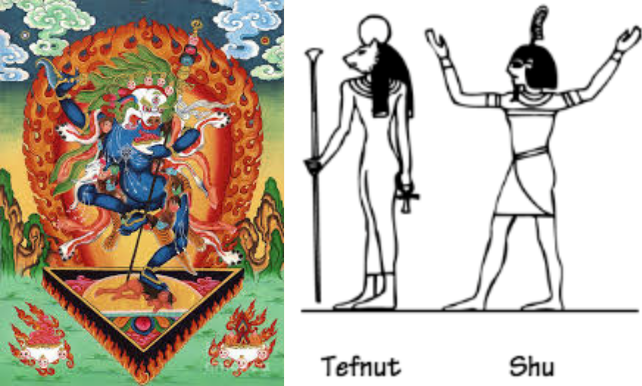 جرالد مسی، به داستانی از آپولودوروس آتنی اشاره میکند که انسان امروزی به خاطر آن به وجود آمد که فقط یک بشر میتوانست به دوران حکومت تیتان ها یا غول ها بر زمین خاتمه دهد. مسی، معتقد است با توجه به این که مردمان ماقبل مسیحیت در گفتمان کشیش های مسیحی چندان تفاوتی با دیوها و شیاطین ندارند، عیسی مسیح میتواند همان بشر نخستین در یک گفتمان انسانی باشد. حکومت تیتان ها توسط زئوس سرنگون شد که نسخه ی یونانی-رومی یهوه خدای یهود است که به عیسی مجسد شد اما قبل از آن، زئوس با بعل مردوخ خدای خالق بابلی تطبیق میشود که یونانیان او را بلوس مینامیدند. اوزیبیوس به یک افسانه ی بابلی اشاره کرده است که بر اساس آن، قبل از آمدن بلوس به زمین، آنجا سرزمینی تاریک بود و فقط جانوران دهشتناک بر آن میزیستند. بلوس با خود نور آورد. نور، آن موجودات را از بین برد و بلوس به یکی از ملازمانش دستور داد تا سر بلوس را قطع کند و خون گردنش را با زمین بیامیزد تا نسل جدیدی از جانوران شامل انسان ها در زمین پدید بیایند که به نور عادت داشته باشند. این دوره ی جانوری اولیه ی خلقت، با افسانه های سرخپوستان امریکا و بومیان افریقای غربی درباره ی پبدایش جهان توسط شش روح جانوری اولیه مطابقت دارد که میتوانند 6روز اول خلقت در تورات را نمایندگی کنند. در افریقا ترکیب ارواح گروه نزد قبایل مختلف متفاوت است ولی جانوران شناخته شده چون شیر، اسب آبی، تمساح، مار و شاهین را در بر میگیرند. آدیتیاهای هندی هم قبل از این که یک گروه هفت تایی شوند یک گروه شش تایی بودند. اما یک افسانه ی دیگر هندو میگوید که در ابتدا 6روح خلقت به شکل 6زوج دوقلو درآمدند و به آنها یک روح هفتم اضافه شد که یکتا بود. مسی، دوقلو بودن ارواح پیشین را معادل با دوگانه بودن هر زوج از جانوران در قالب های نرینه و مادینه میکند و برجستگی دوقلوی خلقت در دایره ی سیاه و سفید چینی تایچی را مطرح میکند که در آن، نیروهای متضاد یین و یانگ، به نرینه و مادینه تفسیر میشوند. در مقابل، روح یگانه ی هفتم را معادل روح الهی و قابل تطبیق با آدم باغ عدن میداند که نخست دوجنسه بود و بعدا بخش زنانه اش به شکل حوا از او جدا شد. بدین ترتیب، انسان نخست به شکل روحی ناجسمانی و متفاوت از جانوران غریزی زمینی بر زمین آمد و بعد خواص دوگانه ی جانداران پیشین را یافت و درست مثل داستان اخراج آدم و حوا از باغ عدن، این، آغاز انحطاط جسمانی روح بشر بود. دوجنسه بودن آدم اولیه زمانی که بر پهنای آشوبناک اولیه فرود آمد، قابل مقایسه با ظهور هورس به شکل یک پسر 12ساله با ظواهر دوگانه ی مرد-زن بر روی یک نیلوفر آبی بر پهنه ی رود نیل قابل تطبیق است. هورس به جنگ نیروهای سیت میرفت که نیروهای تاریکی و معادل تایفون و تیتان ها بودند. مواضع سیت و هورس، تبدیل به قطبین فرضی جهان و باعث ایجاد نظم گیتی شدند و بعد دوگانه ی نور و تاریکی را به تضاد شیرهای دو افق شرق و غرب به جای نبردگاه های طلوع و غروب، منعکس کردند. موضع هورس در نواحی استوایی و در مقابل موضع سیت در یخبندان تاریک قطب شمال به وجود آمد و هر دو آنها در زمره ی نیروهای هفتگانه ی پتاح تانن در خلقت جهان زمینی بودند. این نیروهای هفتگانه در تکمیل هم به صورت روحی یگانه، "علی" نامیده میشدند که مسی یادآوری میکند یکی از تلفظ های ایلی/اله/الوهیم برای خدای اعظم سامیان است که در تورات با یهوه تطبیق شده است. این نیروهای هفتگانه همان شش نیروی اولیه به اضافه ی اصل الهی هفتمی هستند که بر انسان فرود آمد و این از افسانه ای قبطی معلوم میشود که مطابق آن، وقتی نیروهای پتاح، انسان را آفریدند او نمیتوانست راه برود و مثل کرمی بر زمین میخزید تا این که یگانه ی برتر، روح خود را بر این موجود ضعیف فرود آورد و او توانا شد. بنابراین، علی فقط با ظهور انسان به کمال رسید و در این کمال، معادل عیسی مسیح بود و عیسی مسیح هم کسی نبود جز بلوس که خود را برای خلقت جهان جدید قربانی میکرد.: