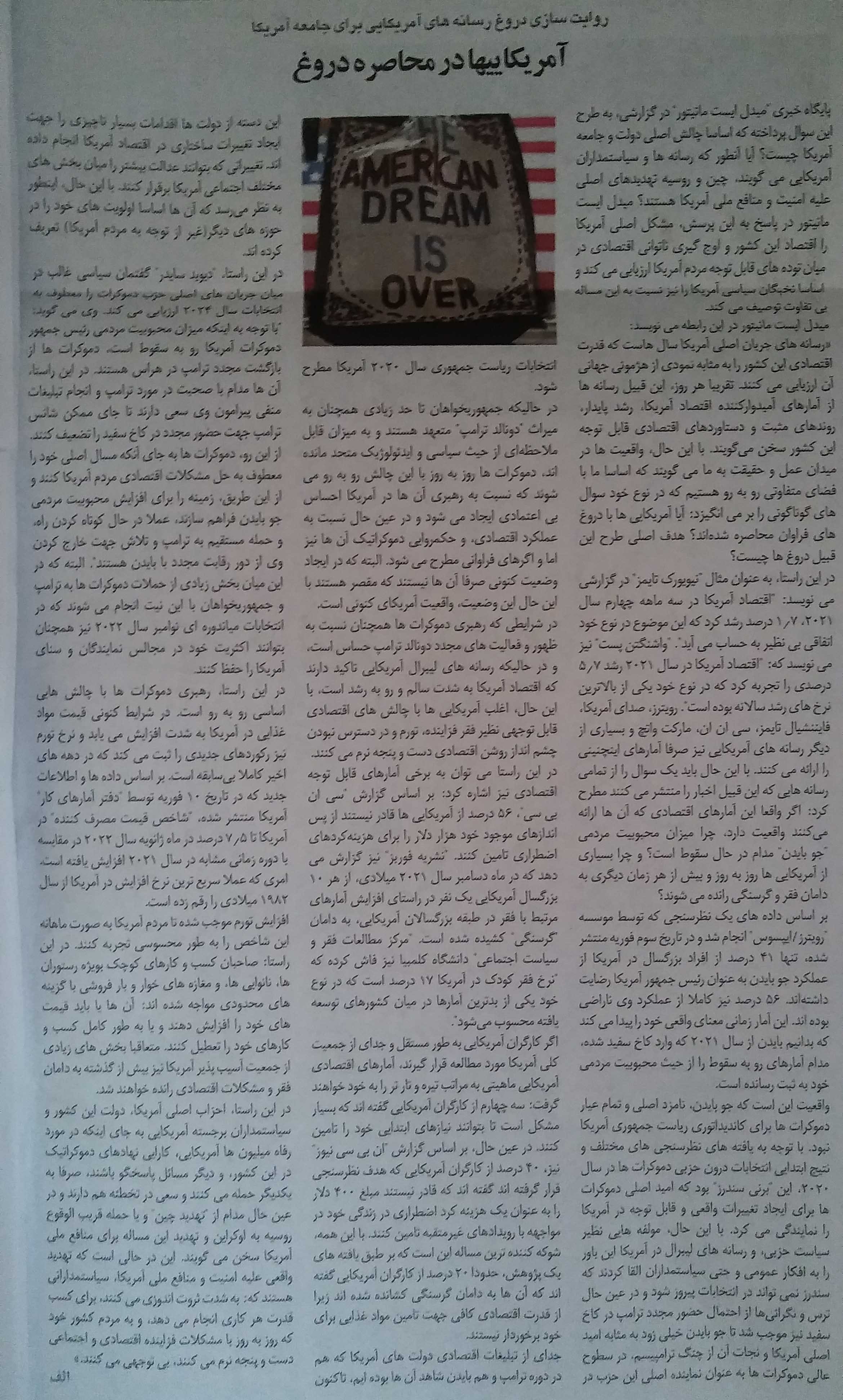 یکی از آخرین نمونه های این دیدگاه در مقاله ی "پایان دکترین تجزیه: چگونه امنیت سرمایه های غربی، فرصتی برای احیای ملی ایران فراهم آورده است؟" از سعید جوکار کارشناس ارتباطات است که در شماره ی 238 نشریه ی صدا (4مرداد 1404) درج شده است. وی معتقد است در شرایطی که «برای دهه های متمادی، روایت غالب در عرصه ی بین المللی، ایران را به عنوان اصلی ترین "بازیگر بنیادگرا" و "منبع بی ثباتی" در خاورمیانه به تصویر میکشید، اما امروز با ظهور پارادوکس ژئو اکونومیک، ایران این شانس را دارد که با یک دیپلماسی هوشمندانه و کنشگرانه، این روایت را به چالش کشیده و خود را به عنوان یک "قدرت مسئولیت پذیر" و "لنگر ثبات بالقوه" تعریف کند.» در بخشی از این مقاله میخوانیم: