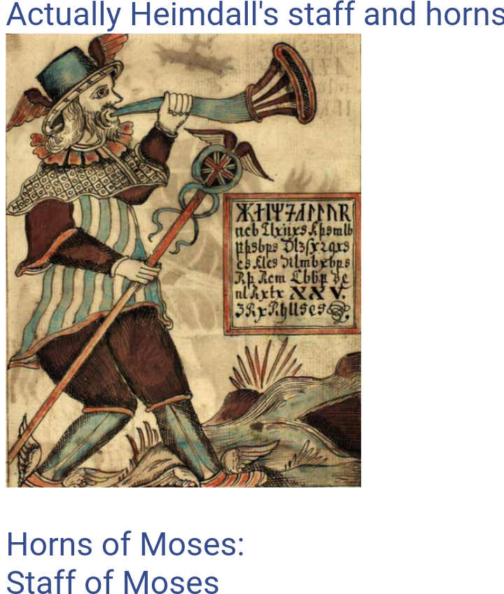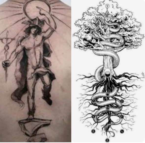 بنا بر اساطیر نورس، اودین رئیس خدایان اسکاندیناوی، 9شبانه روز، خود را از درخت یگدراسیل حلق آویز کرد درحالیکه نیزه ای در پهلویش فرو رفته بود. او این کار را کرد تا به روشنبینی برسد و نتیجه ی این روشنبینی، کشف دانش رون ها یا خطوط قدیم کفار اروپایی بود. به نظر دیوید ماتیزن، کشف نوشتار توسط اودین و طی این فرایند، با اهدای نوشتار از سوی هرمس و تحوت به انسان ها در اساطیر یونانی و مصری مرتبط است بخصوص ازآنروکه اودین نورس، مانند هرمس یونانی، موکل سیاره ی عطارد است. فرق بزرگ در این است که درحالیکه اودینی که فعلا میشناسیم، در مقام رئیس خدایان حامی نظم و قانون است، هرمس خدای دزدان و حیله گران و جاده های غیر طبیعی است. موقعیت اخیر بیشتر با وضعیت لوکی خدای شرور نورس مطابقت دارد. معما آنجا گشوده میشود که میبینیم لوکی و اودین هر کدام رگی از خونشان را باز کرده و به هم تزریق کرده اند تا مثل هم شوند. درواقع اودین و لوکی یک نفرند که بر اساس کارکردهای مربوطه به دو شخصیت متضاد تقسیم شده اند و این دو شخصیت متضاد، مابه ازای دو مار به هم پیچیده به دور کادوسئوس یا عصای هرمس به نشانه ی تضادند. بعضی اوقات مارها را در تصاویر طوری به هم میپیچانند که شبیه نوشتار اروپایی عدد 8 شوند. هرمس زمانی که ریشو تصویر میشود، به اودین نزدیک میشود و زمانی که ظاهر هرمافرودیت دارد به لوکی.: